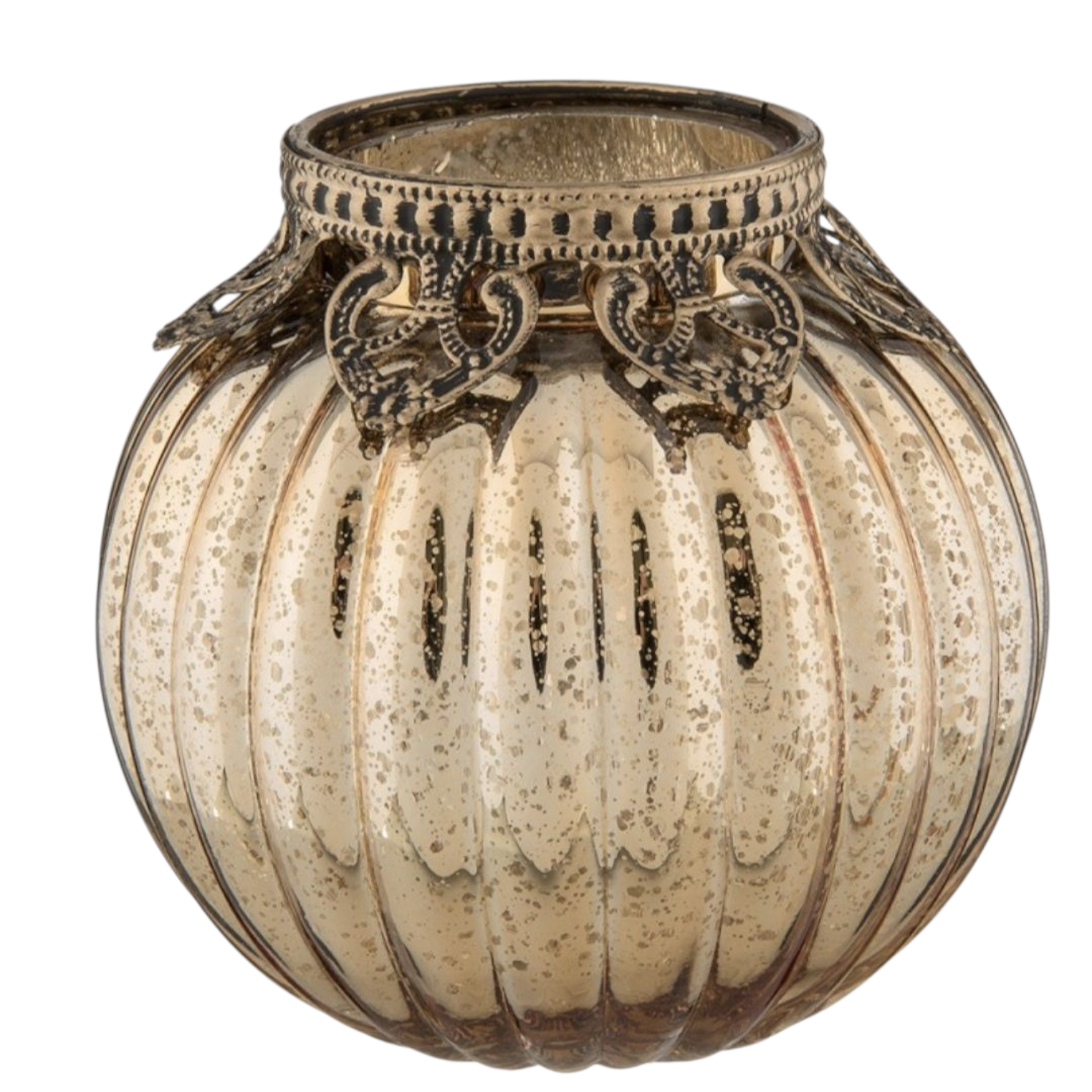 Theelichthouder van goudkleurig glas met een decoratieve rand van mat goudkleurig metaal, in romantische stijl met een landelijke uitstraling
