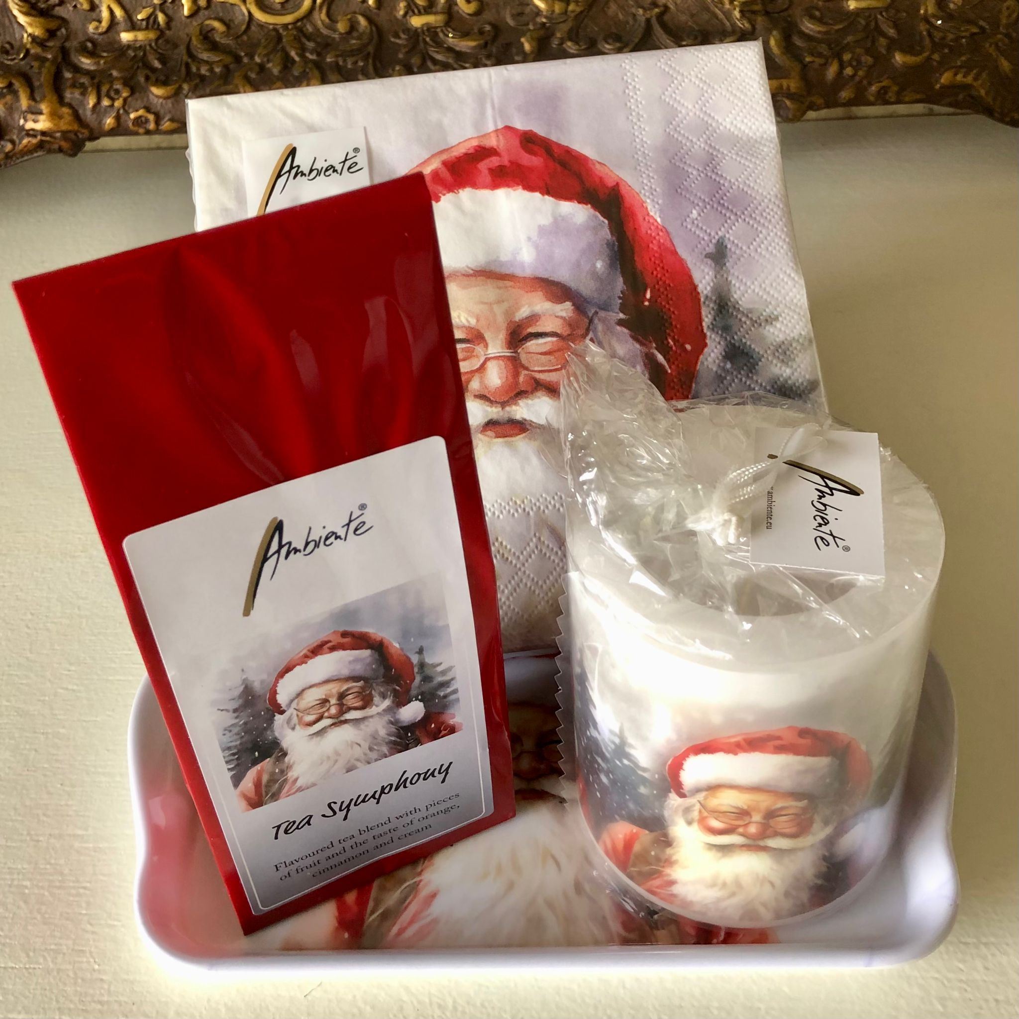 Kadoset kerstman met dienblad,thee,kaars,en servetten