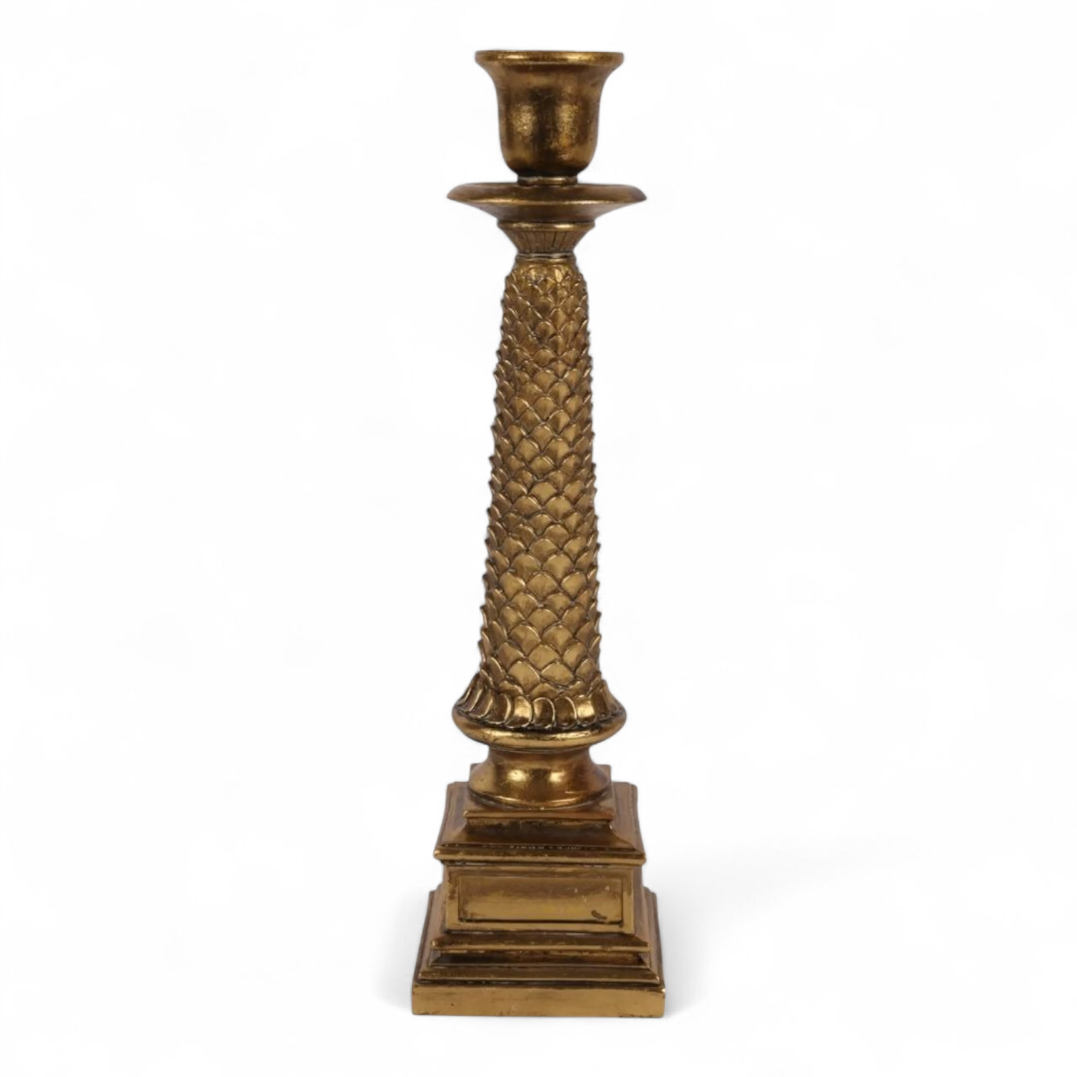 Geef sfeer aan elke ruimte met deze sierlijke gouden kandelaar gemaakt van polyresin. Deze kaarshouder is In 2 varianten verkrijgbaar. Combineer ook met onze andere decoratieve kandelaars en accessoires