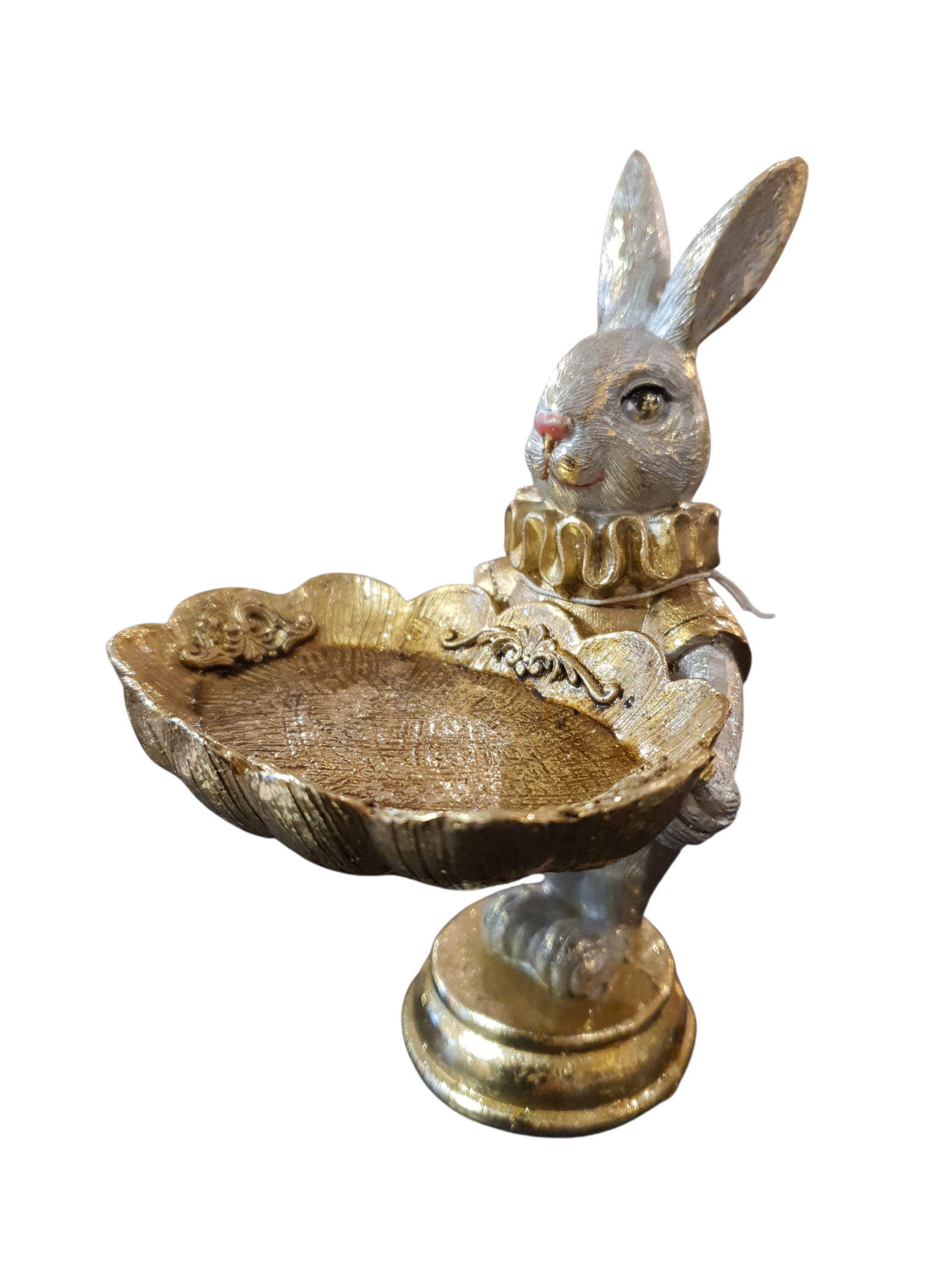 Een decoratieve goudkleurige schaal met een beeldje in de vorm van een konijn op de rand. Gemaakt van polyresin. Het is een prachtige decoratie en een perfect cadeau-idee