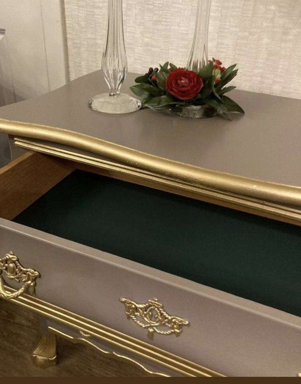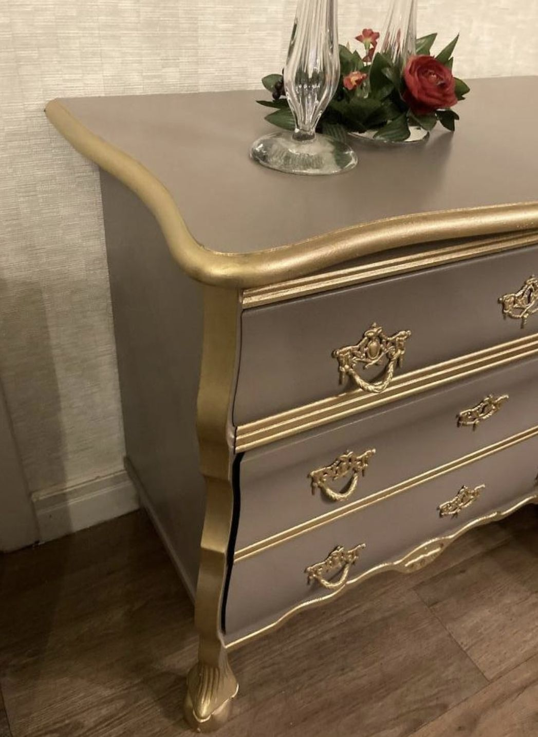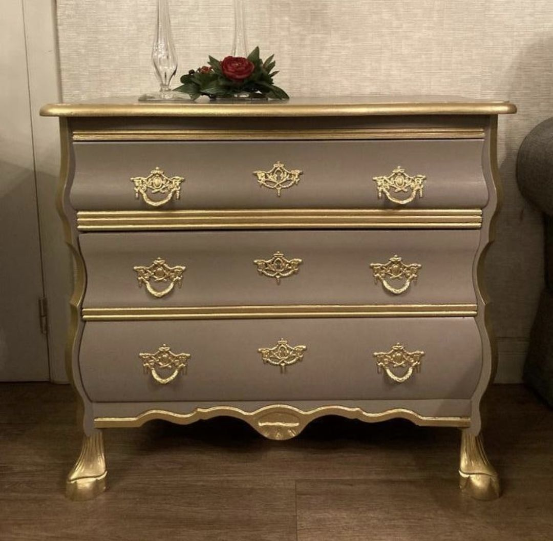 Prachtig buikkastje, professioneel gerestyled in een stijlvolle donkertaupe kleur met elegante gouden accenten. De kast heeft een unieke uitstraling en is een echte blikvanger in elk interieur.