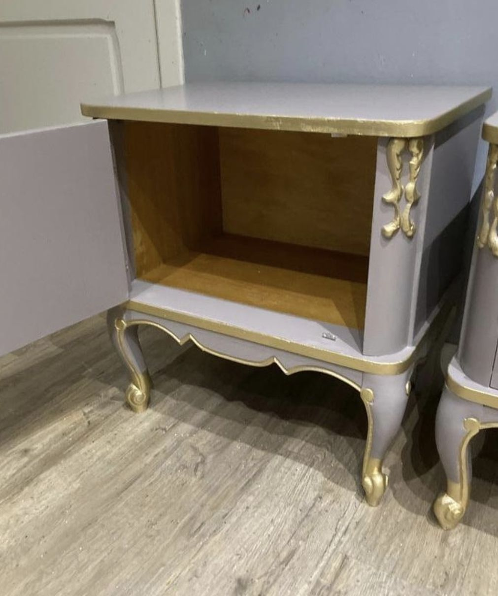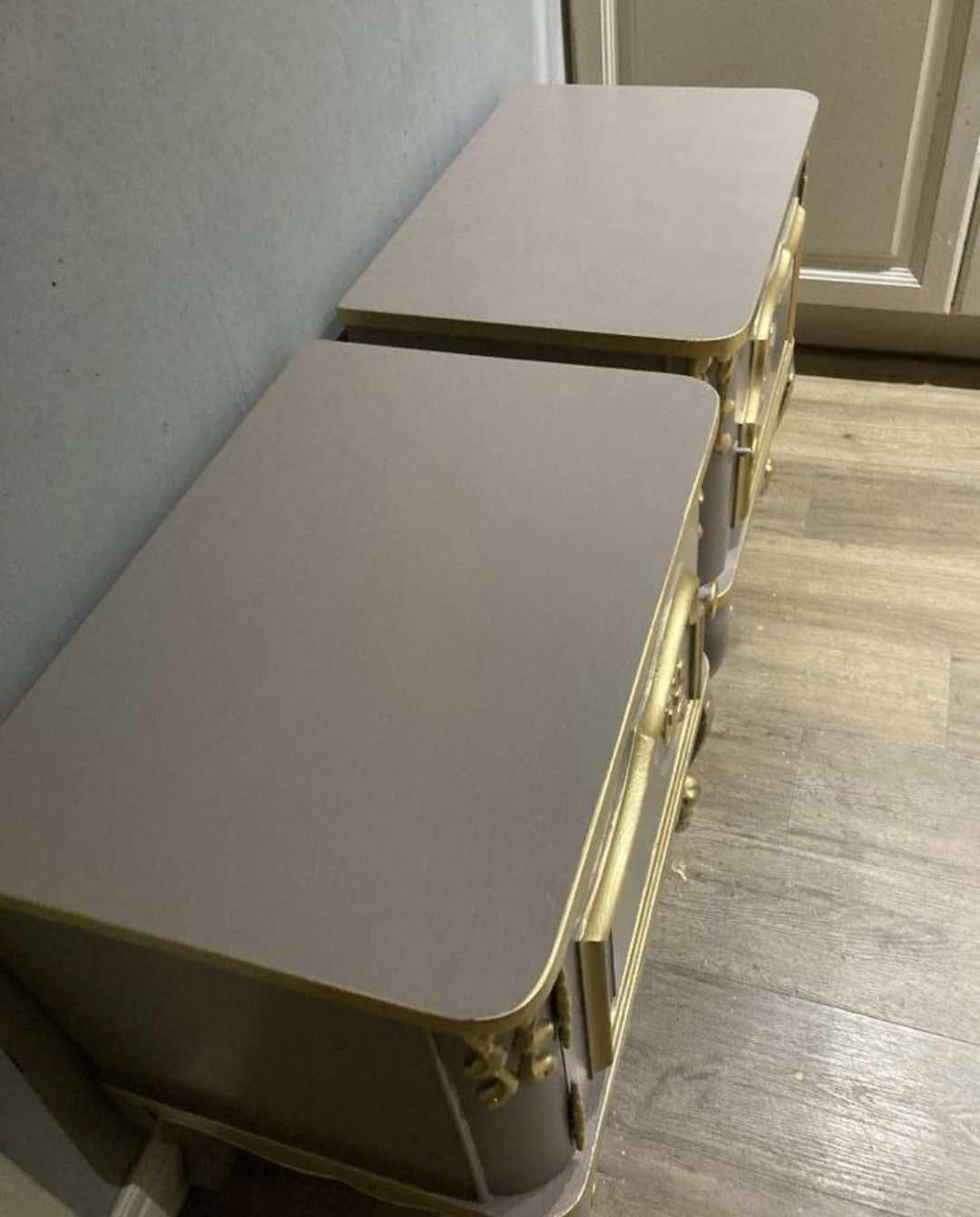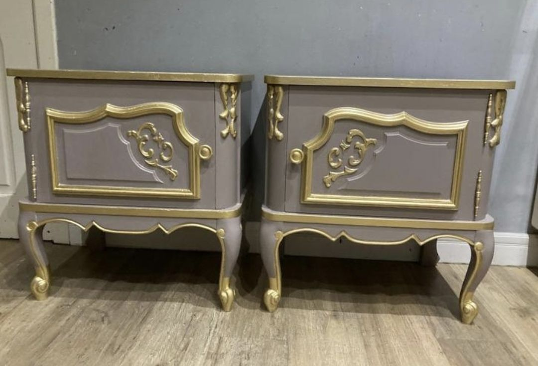 Twee prachtig gerestylde Ann nachtkastjes in een stijlvolle taupe kleur met gouden accenten.