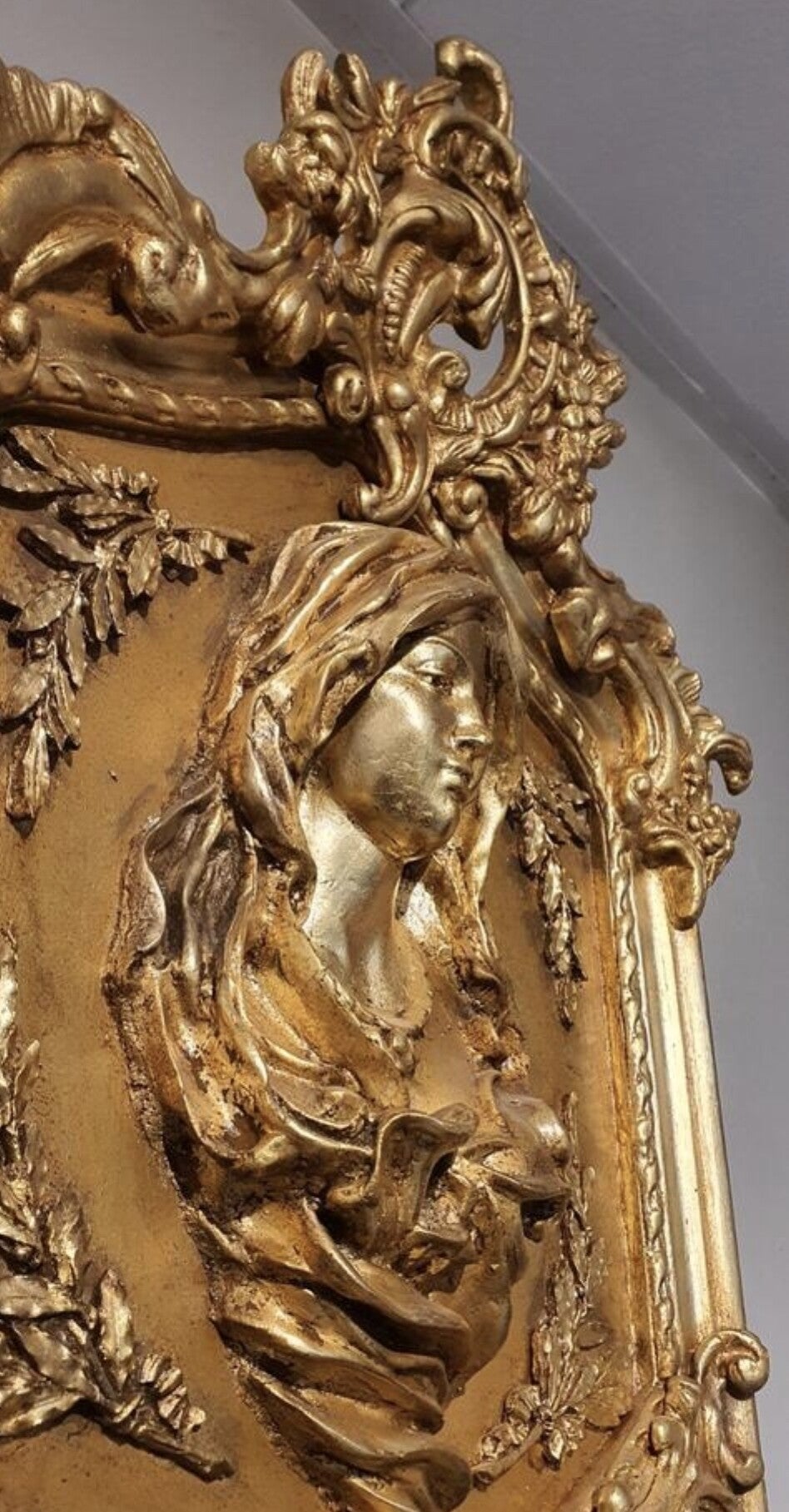 Ze zijn gedetailleerd afgewerkt met een gouden kleur en een afbeelding van Madonna. Perfect voor de liefhebber van klassieke en elegante decoratie. De spiegel met facetgeslepen glas en klaar om uw huis te verfraaien.