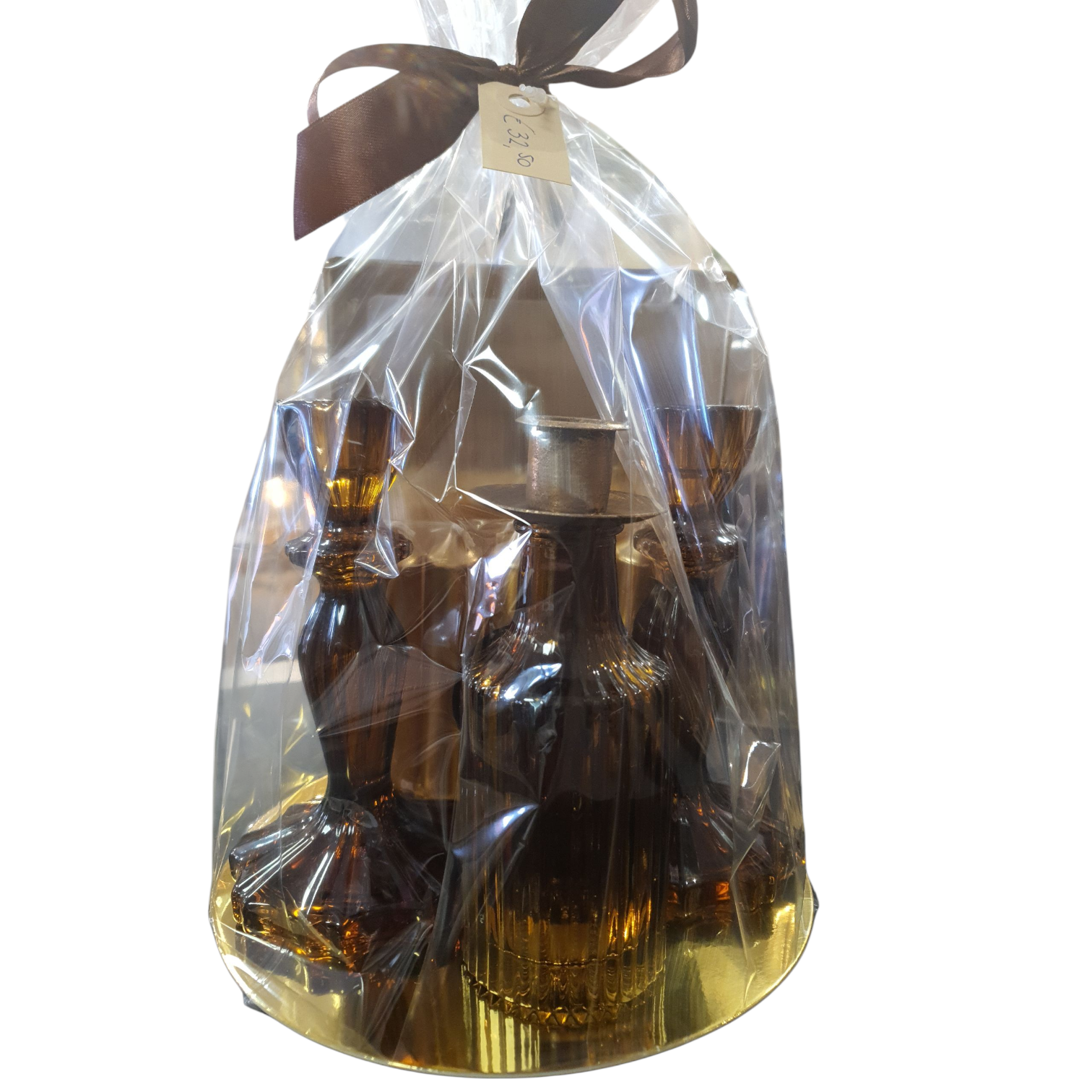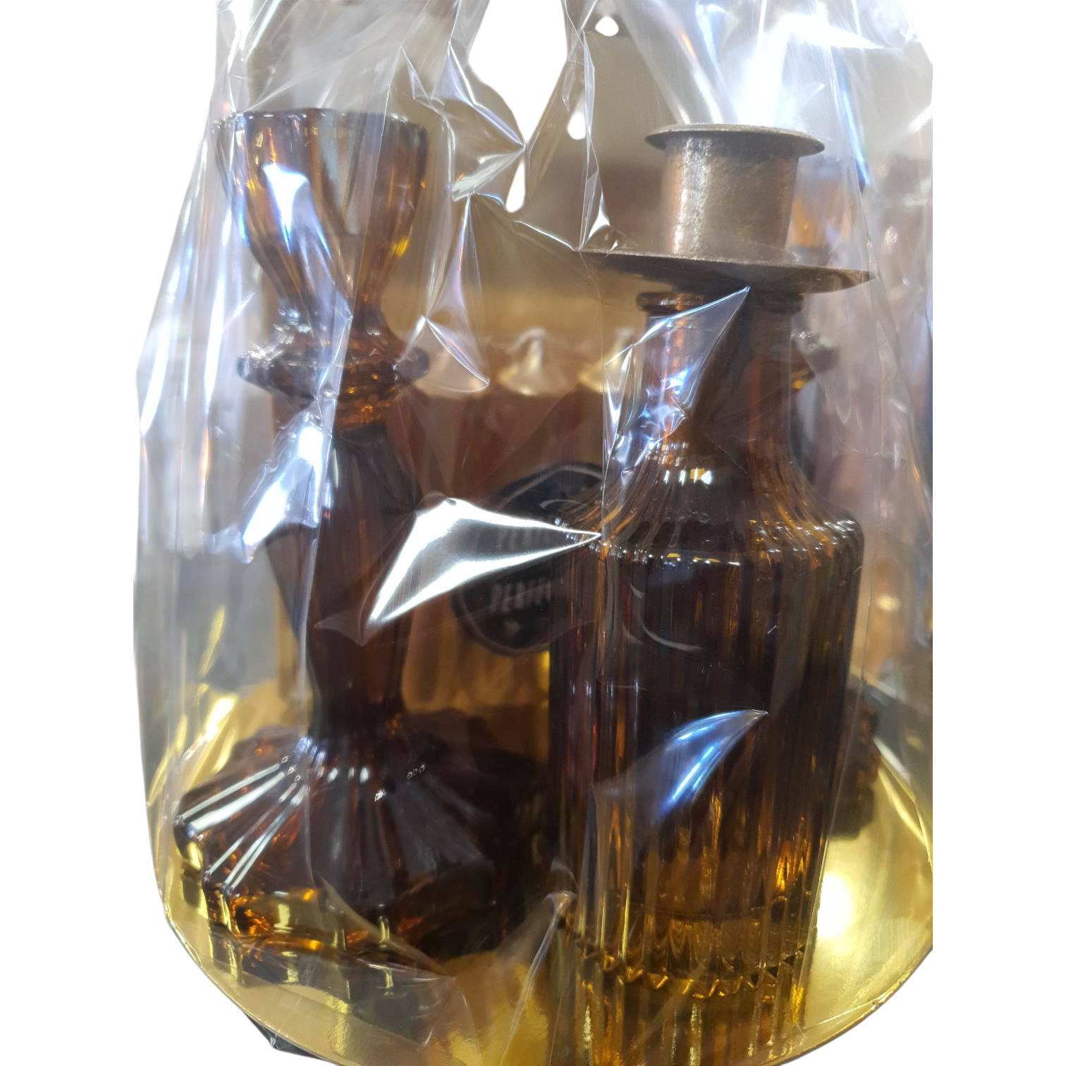 Prachtig kadoset met 3 bruine glazen kandelaren met 6 gouden diner kaarsen en een dienblad
