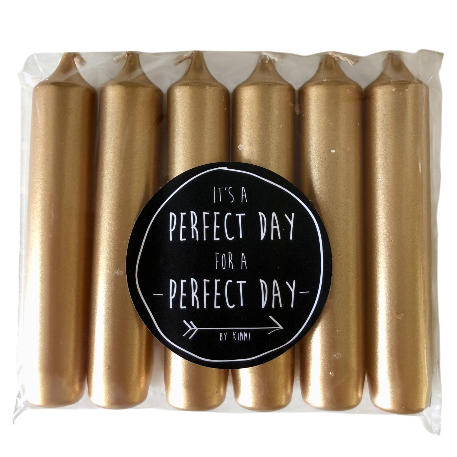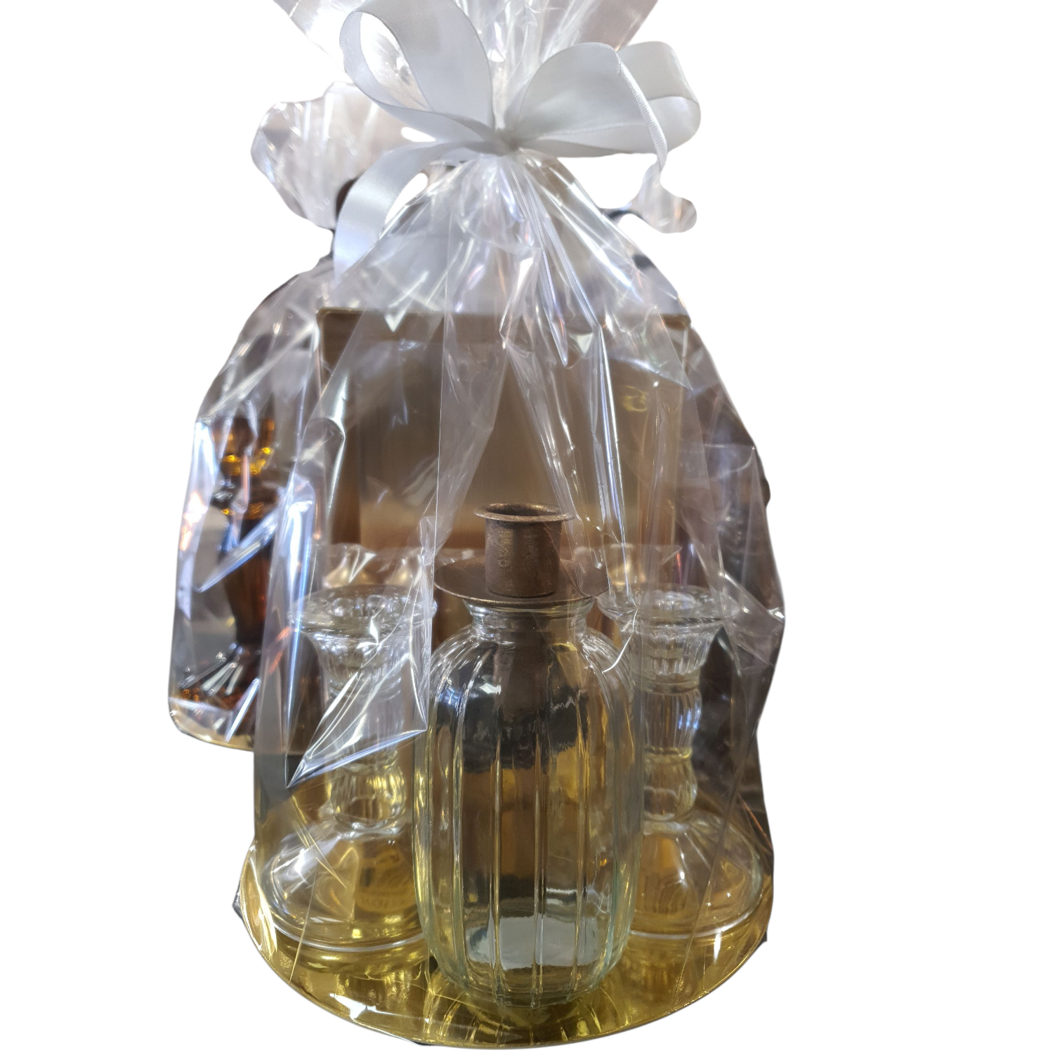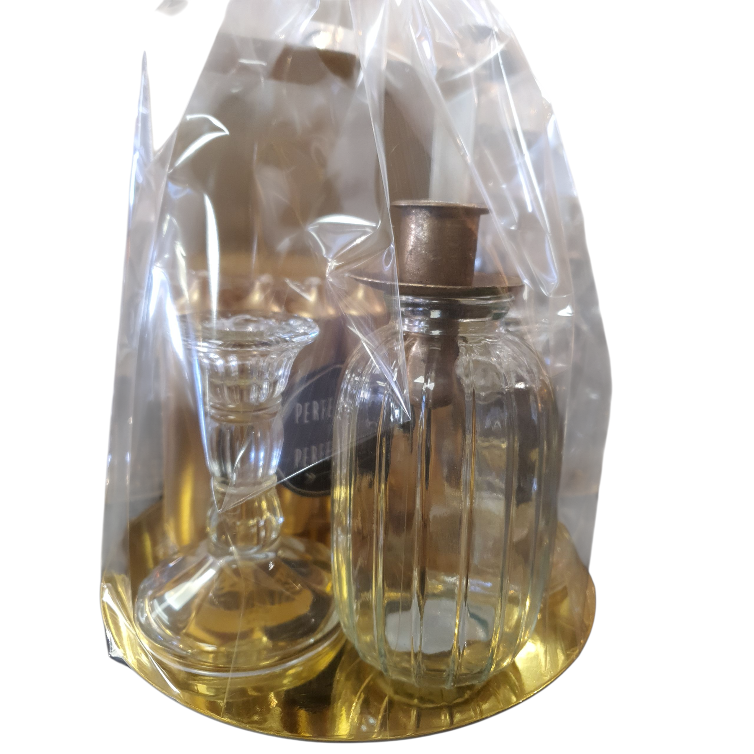 Kadoset kandelaren transparant met 6 gouden diner kaarsen en dienblad
