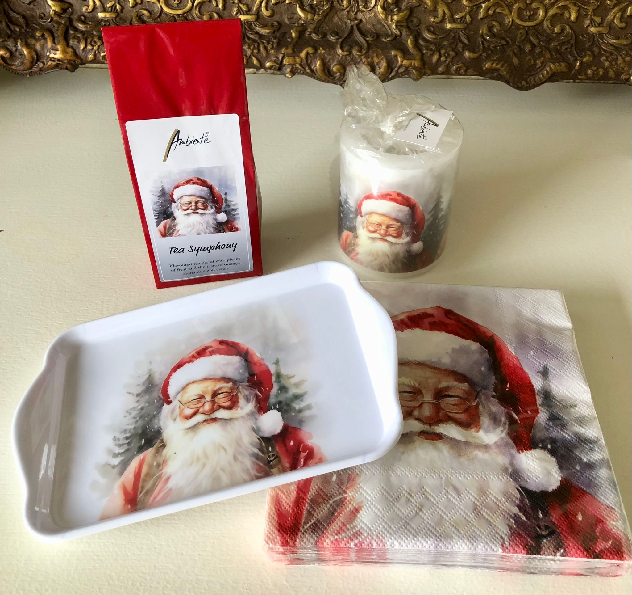 Kadoset kerstman met dienblad,thee,kaars,en servetten