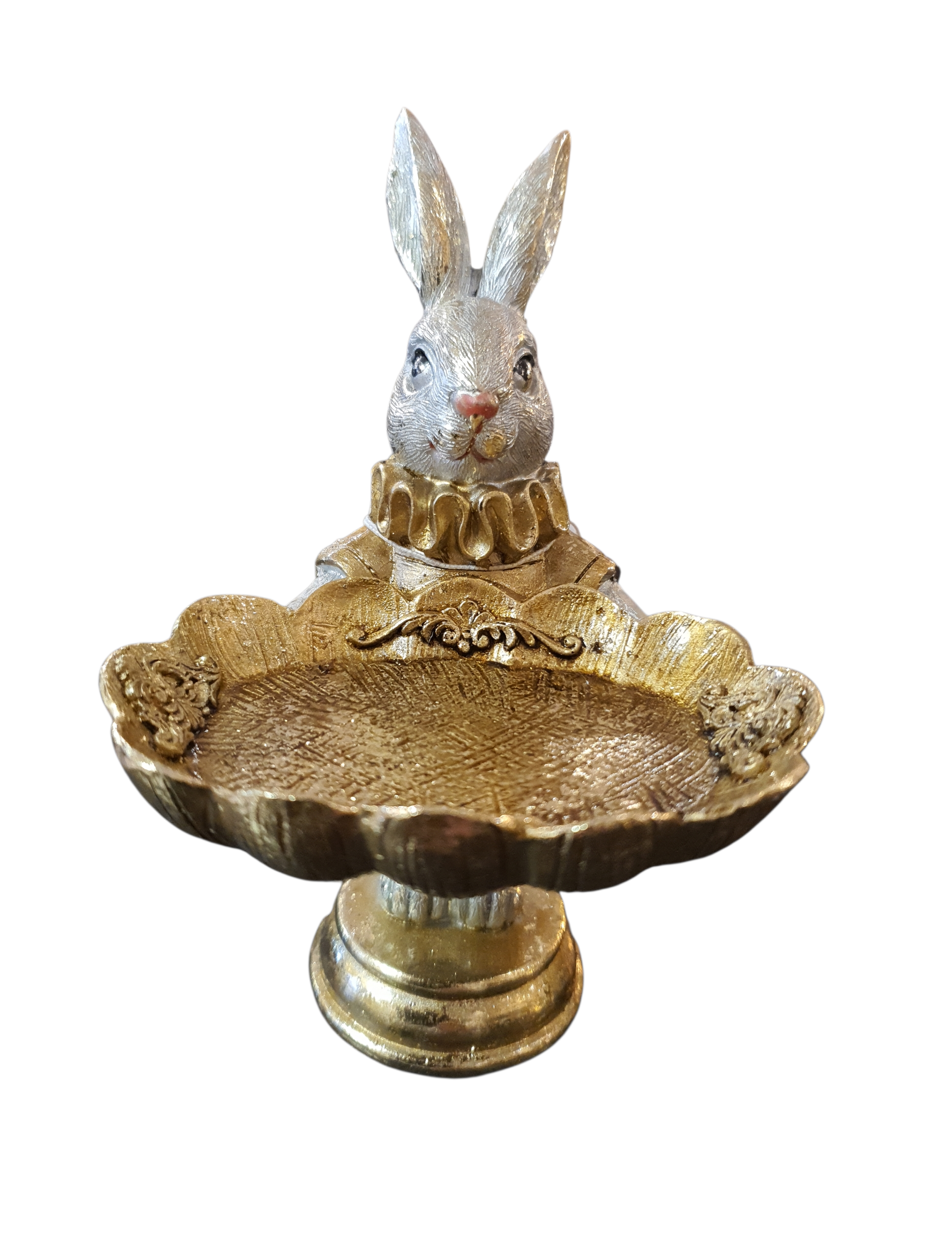 Een decoratieve goudkleurige schaal met een beeldje in de vorm van een konijn op de rand. Gemaakt van polyresin. Het is een prachtige decoratie en een perfect cadeau-idee