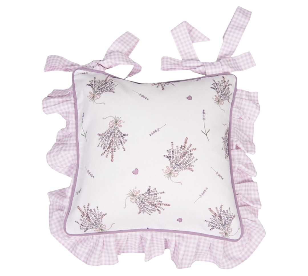 Katoen stoelkussen hoes lavendel motief in romantische stijl met een landelijke uitstraling. Uit de keukentextielserie "Lavender Garden